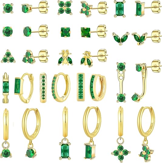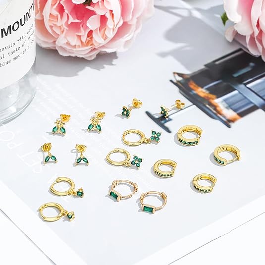 Unique design: These tiny gold earrings consist of 15 different styles, each inlaid with green cubic zirconia. You can wear them alone or combine them. The classic and simple style will make you look more elegant.